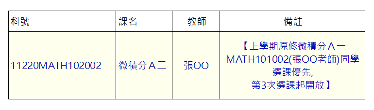 部分學年課程(如普通物理、微積分、經濟學原理、大一英文等),其下學期課程科目在備註欄會標示「原修者優」(如下圖),表示在第一至第二次選課期間,名額將優先保留給上學期修讀該班的同學。