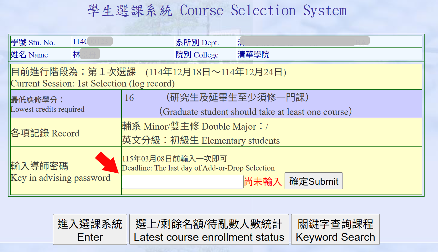 “You must enter the advising password for the 114-2 semester before registering for courses.”