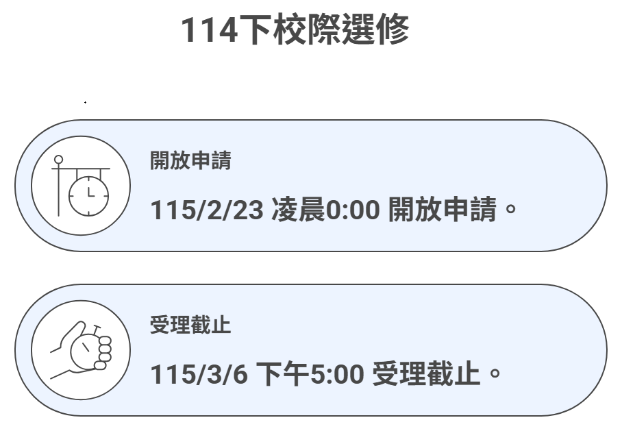 - 留意受理截止日期:至外校選課 以及 之後欲辦理停修,全部手續須於兩校 最早 截止日期前辦理完成 (各校均採實體方式受理)